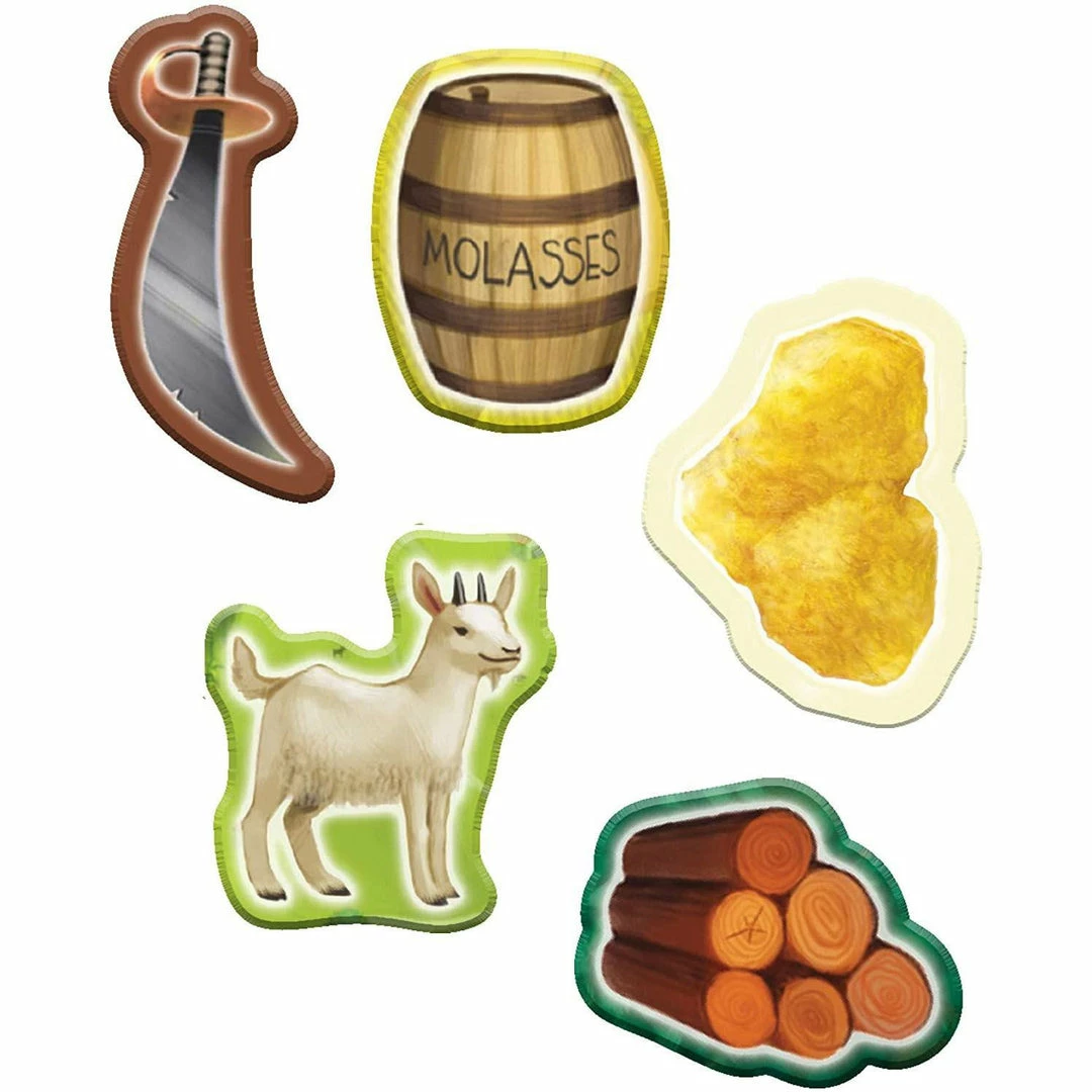 Catan: Juniorย takes place on a ring of islands where 2 to 4 players build hideouts and encounter the mysterious Spooky Island, where the Ghost Captain lives. Each island generates a specific resource: wood, goats, molasses or swords, and players can acquire gold. Each player starts with two pirate hideouts on different islands, and they can use the resources they acquire to build ships, hideouts or get help from Coco the Parrot. By building ships, they can expand their network; the more hideouts they build, the more resources they may receive. Just watch out for the dreaded Ghost Captain! For Ages: 8 – 108