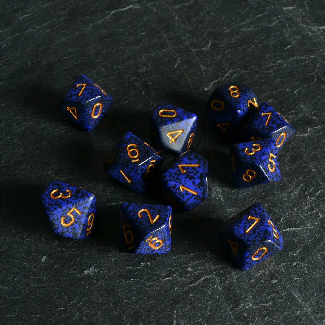 Set of 10 Speckled D10 Dice in the colour Golden Cobalt from Chessex.