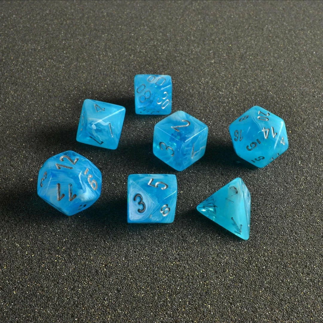Luminary Polyhedral 7-Die Set in colour Sky/Silver from Chessex. These dice glow in the dark.