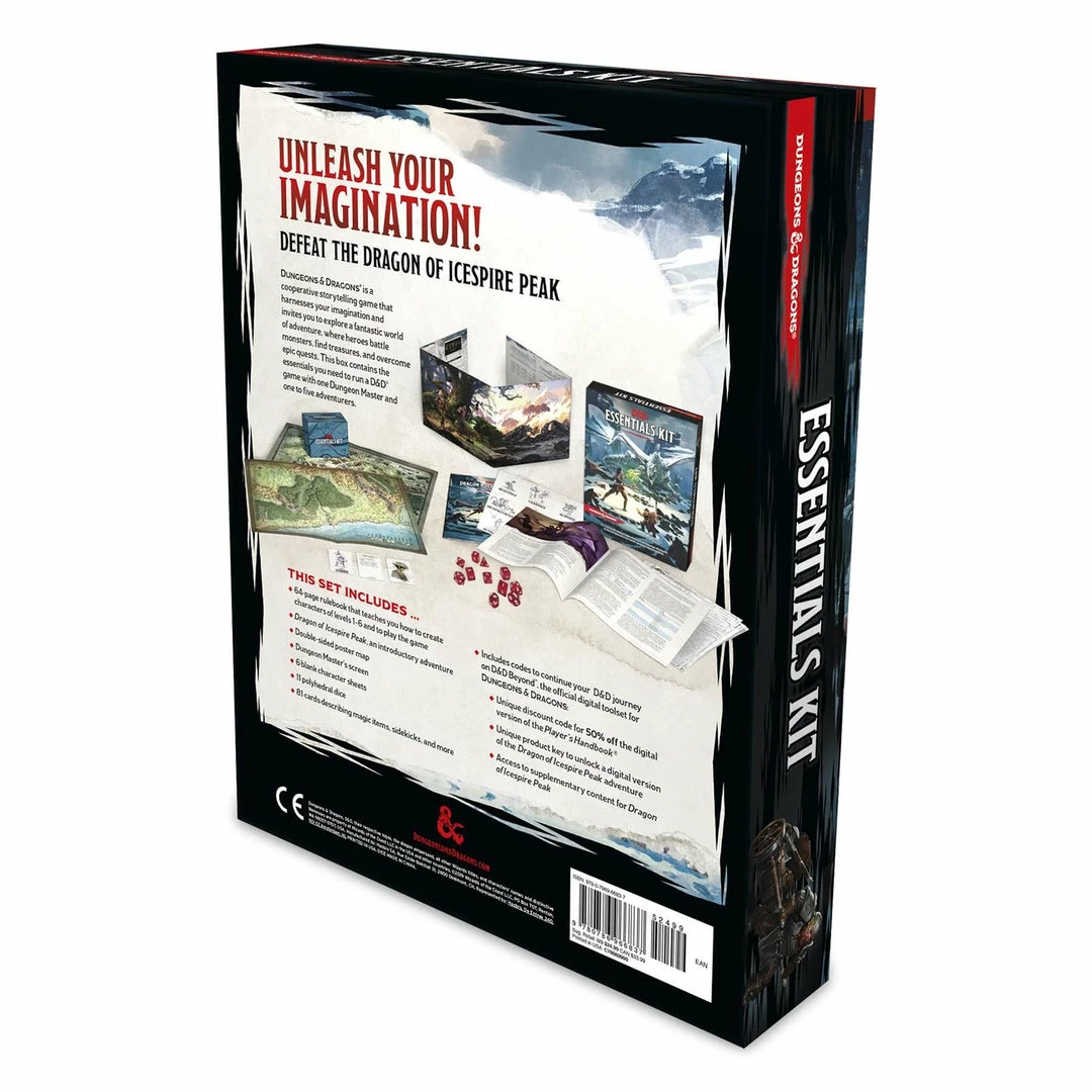 Everything you need to create characters and play the new adventures in this introduction to the worldβs greatest roleplaying game. Designed for 2-6 players. “The Dungeons & Dragons Essentials Kit is the perfect introduction to the legendary role-playing game.” βForbes “Truly excellent.”βPaste β’ Take your first step into the world of Dungeons & Dragons, or get a more expansive D&D experience after playing the Starter Set. β’ Play with groups as small as two players (one Dungeon Master & one adventurer) for the first time in D&D fifth edition with the introduction of βsidekicks.β β’ Battle and plunder your way through Phandalin in the all new D&D adventure, Dragon of Icespire Peak. β’ Experience the thrill of being a Dungeon Master behind a four-panel DM screen with at-a-glance game rules for quick and easy reference. β’ Continue your Dungeons & Dragons journey with codes to unlock content on D&D Beyond, the official digital toolset for D&D. Components: (1) rulebook, (1) Dragon of Icespire Peak introductory adventure, (6) blank character sheets, (11 ) dice, (1) 33″ Γ 8.5″ Dungeon Master’s screen, (81) cards for magic items, sidekicks and more, (1) 21″ x 15” double-sided poster map for use with the adventure, (1) code for 50% the digital version of the Player’s Handbook, access to supplementary content, including additional adventure materials to continue the story into higher levels of play.