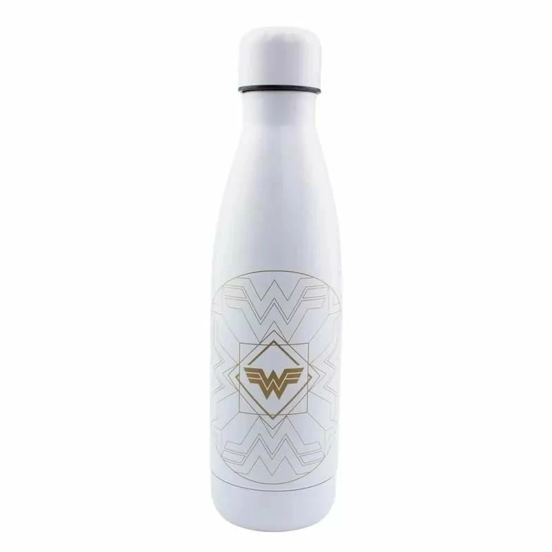 Even superheroes need to drink the recommended amount of water each day to stay healthy and this 460ml (15floz) metal water bottle will help you achieve your daily goal. A thoughtful gift for all ages that features golden decals from the 2020 movie Wonder Woman 1984. The screw top lid will keep your drink fresh and prevent spills. 460ml (15floz) double-walled stainless steel water bottle with printed design.
