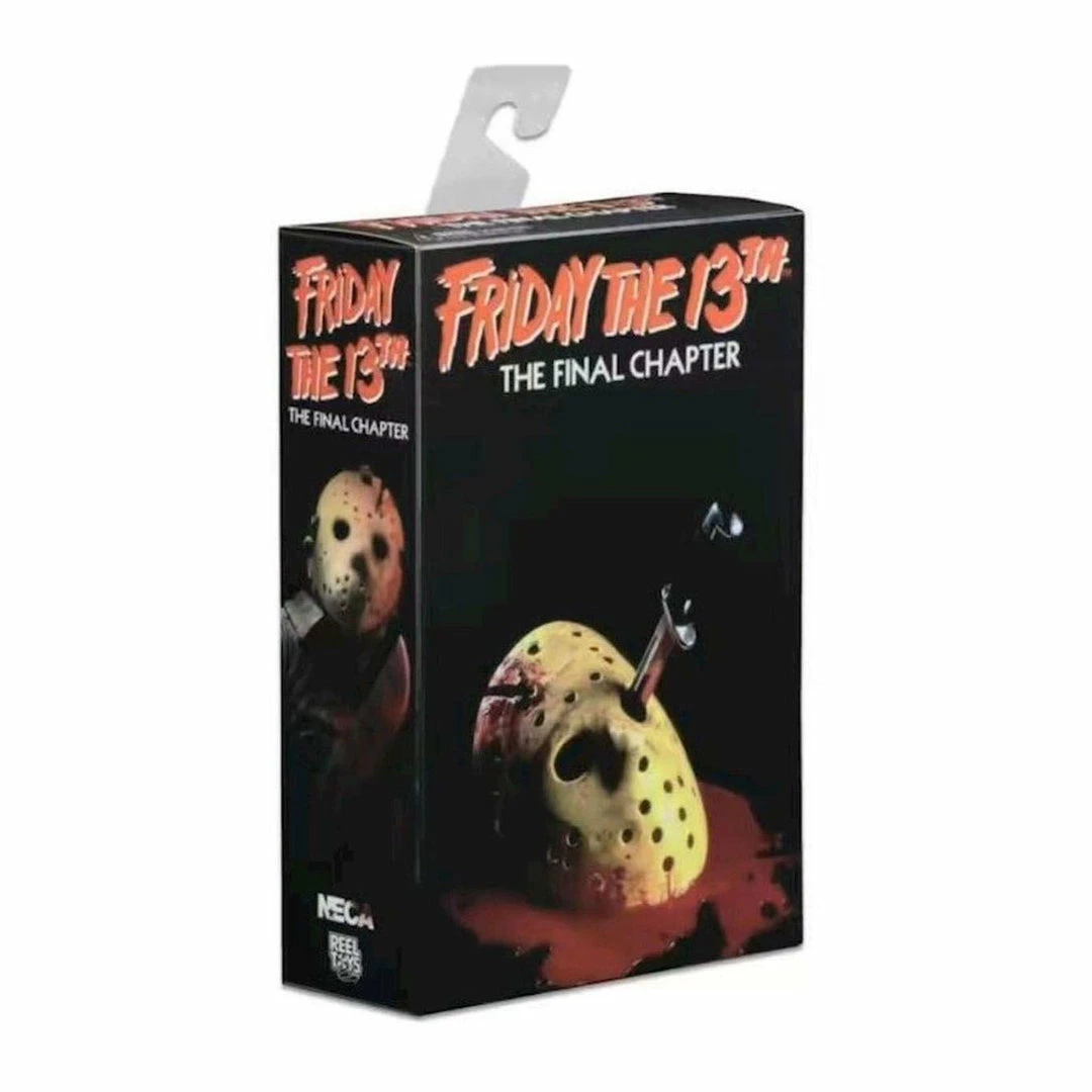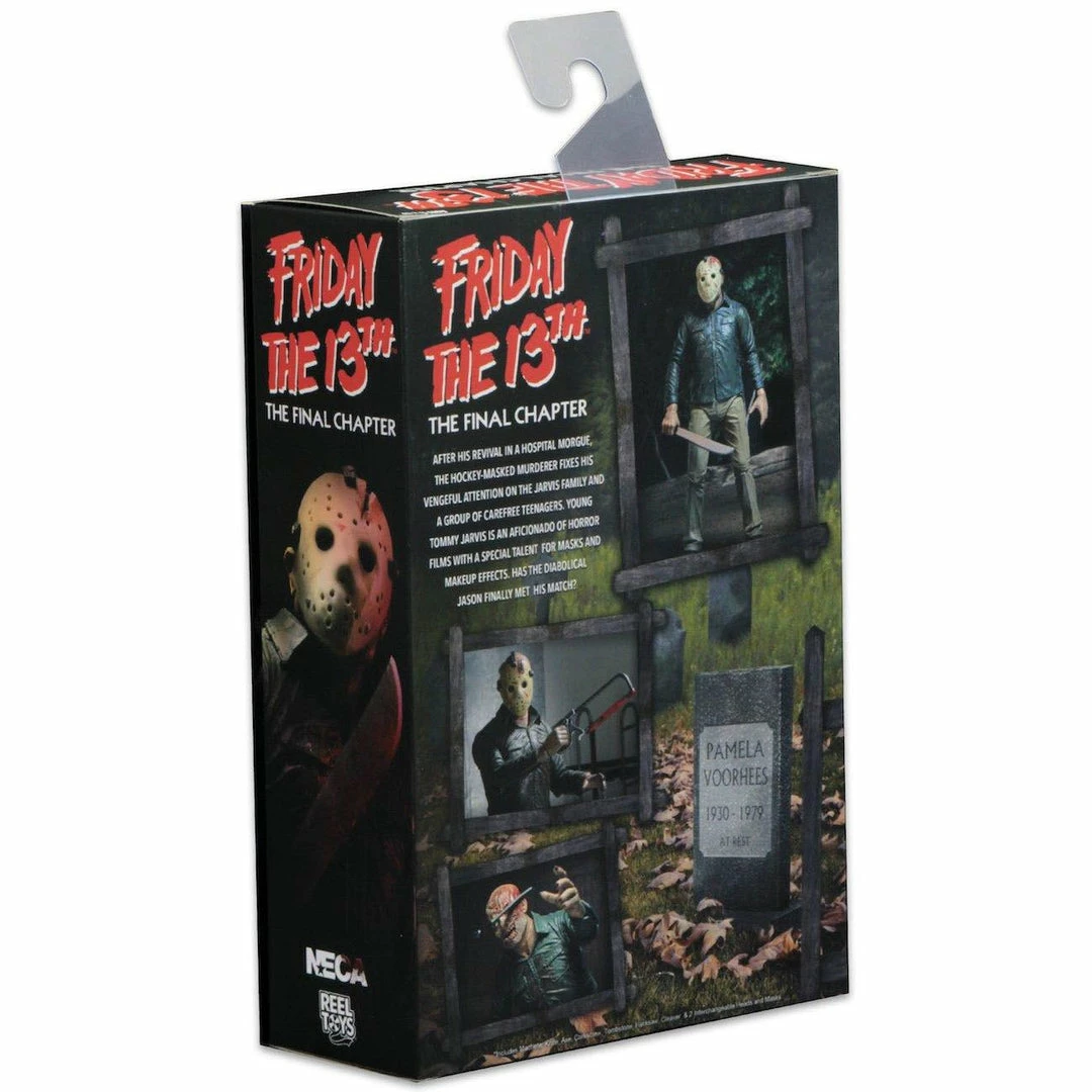 Friday the 13th Jason Figure: NECA is proud to present the definitive collectors version of Jason as he appeared in Friday the 13 Part 4: The Final Chapter! Part 4 Jason has received the Ultimate treatment, with deluxe packaging, tooling improvements for production of masks, and a slew of new accessories. Plus, you can recreate his (not quite) fatal wound by sliding his machete into the side of his head. This deluxe 7″ scale action figure features over 25 points of articulation and is packed with accessories. It comes with two masks, two interchangeable head sculpts, knife, corkscrew, tombstone, hacksaw, cleaver, machete, and axe. The packaging is deluxe too, with a front window flap featuring the movies original one-sheet poster art!