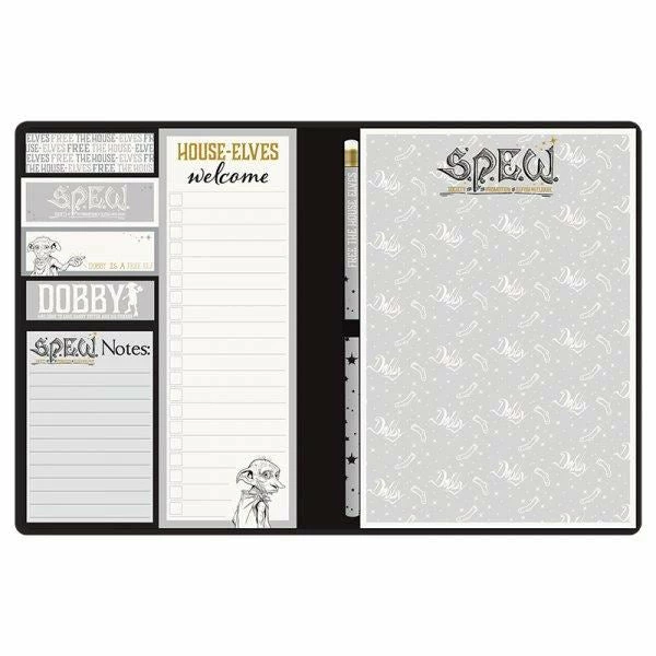 Show your support for House Elves with this Harry Potter ‘Society for the Protection of Elfish Welfare’ (S.P.E.W.) Multi-list Notebook. Comes with a hardback cover, elasticated fastening, and gold foil detailing on the cover. Within the notebook you will find everything you need for attending S.P.E.W. meetings; HB Pencil, sticky notes, tags. a section for lists and an A5 ruled writing pad.