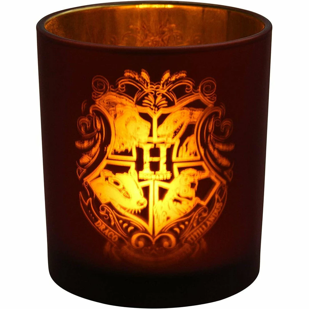 Witches and wizards alike can now create a calming ambiance in their own magical surroundings with this semi-transparent candle holder. This burgundy coloured glass tea light candle holder features the crest of Hogwarts School of Witchcraft and Wizardry featured in the Harry Potter stories. The escutcheon displays the mascot of each of the school’s four houses: the Gryffindor lion, the Slytherin serpent, the Ravenclaw eagle, and the Hufflepuff badger. The crest includes the motto for Hogwarts “Draco Dormiens Nunquam Titillandus”, which translates to “Never tickle a sleeping dragon”. Decorated inside with a rich gold colour that reflects the gentle glow from the battery operated tea light candle included. Makes a great addition to any collection of Harry Potter related memorabilia. Unlike traditional real flame tea light candles, this versatile battery powered tea light candle can be used anywhere in the home. Thoughtful, practical, collectable, and gift boxed this is the perfect gift for Harry Potter fans everywhere.