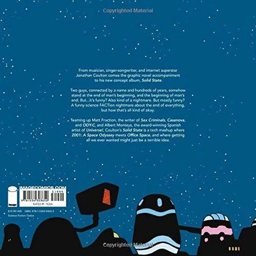 The graphic novel accompaniment (in square-bound, 10 x 10 format) to musician, singer-songwriter, and internet superstar JONATHAN COULTON’s new concept album, SOLID STATE. From JONATHAN COULTON, the singer-songwriter behind Code Monkey and the Portal songs; MATT FRACTION, the writer of SEX CRIMINALS, CASANOVA, and ODY-C; and drawn by the award-winning Spanish artist of Universe! ALBERT MONTEYS comes SOLID STATE, a graphic novel companion to COULTON’s new concept album of the same name. Two guys, connected by a name and hundreds of years, somehow stand at the end of man’s beginning, and the beginning of man’s end. But…it’s funny? Also kind of a nightmare. But mostly funny? A funny science-FACTion nightmare about the end of everything, but how that’s all kind of okay.