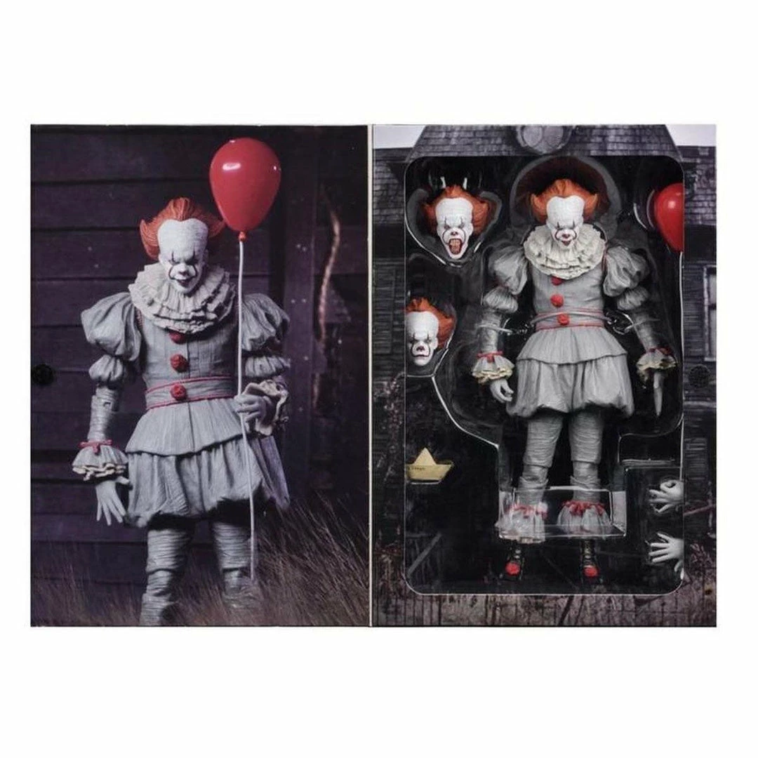 From the acclaimed 2017 horror film IT, drawn from the pages of Stephen Kingβs original novel, NECA presents Pennywise: The Dancing Clown! Based on Bill SkarsgΓ₯rdβs portrayal of the nightmare-inducing clown, this 7β³ scale figure has been painstakingly detailed to be as accurate to Pennywiseβs ornate costume as possible, and is presented in an Ultimate format with special packaging and LED lights inside one of the heads. This version features 4 head sculpts, 3 of which are all-new heads: βJudithβ Painting Head, βEmerging Armsβ Head, and Light-Up βDeadlightsβ Head with LED light inside the mouth. The figure also includes interchangeable articulated insect arms, interchangeable forearms, and 2 pairs of hands. The special window box packaging has a fold down flap in homage to the Dancing Clown scene from the film. Uses button cell batteries, included.