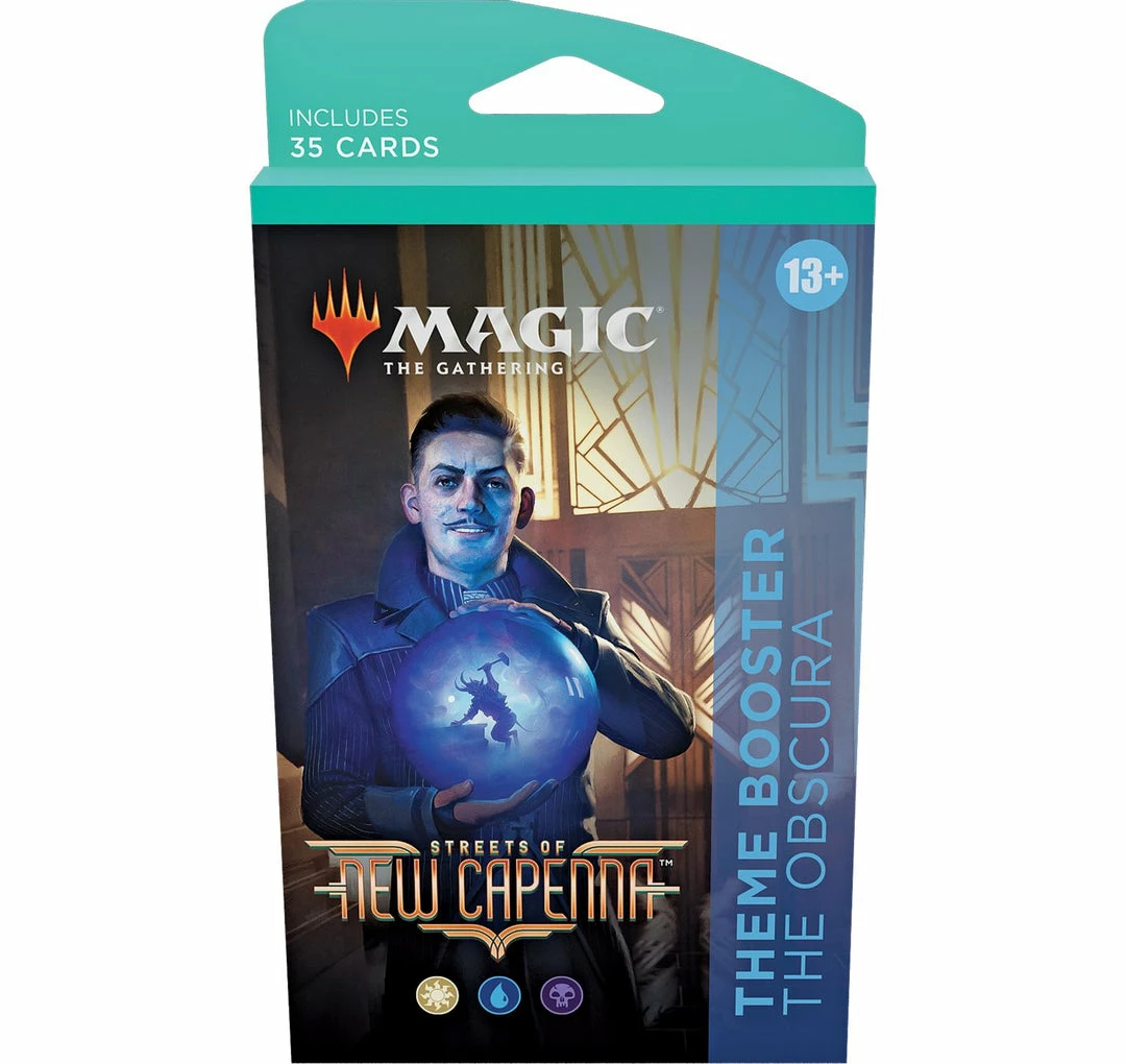 The Obscura Streets of New Capenna Theme Booster (White-Blue-Black) contains 35 cards, with a combination of 1–2 cards of rarity Rare or higher (2 in 10% of packs) and 33–34 Uncommon and/or Common cards. 35 Streets of New Capenna Cards 1–2 cards of rarity Rare or higher in every booster Build a White-Blue-Black deck with the best MTG boosters for deck building Become part of The Obscura crime family, where information is power Establish a criminal empire with your family of gifted magicians