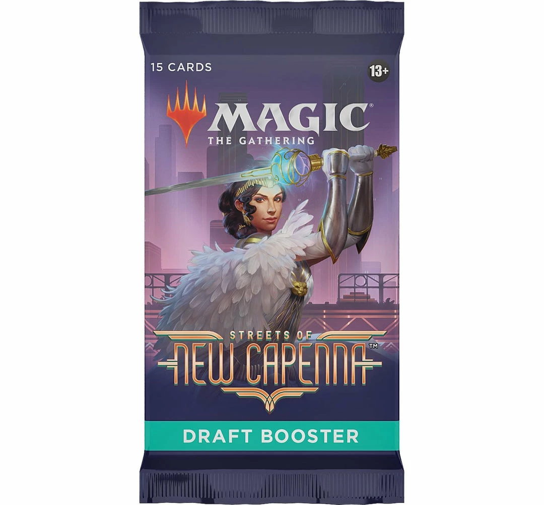 Draft Boosters are specifically designed for the best Magic: The Gathering booster draft play experience. Each Streets of New Capenna Draft Booster contains 15 Magic cards and 1 token, ad card, or counter punchout card, with a combination of 1 card of rarity Rare or higher and 3 Uncommon, 10 Common, and 1 Land cards. A traditional foil card of any rarity replaces a Common in 33% of Streets of New Capenna Draft Boosters. Traditional foil Borderless Mythic Planeswalker in <1% of boosters.