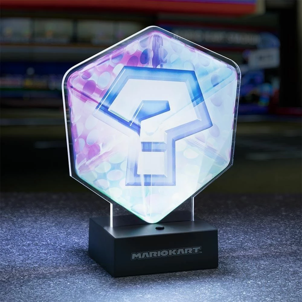 Light up your living space, bedroom or gaming room and have your favourite mystery block by your side with this 22cm (8.6″) tall Mario Kart Acrylic Question Block Light. This stylish display light is ideal for use on your desk, bedside table or shelves and is shaped to resemble the Item Box in its Mario Kart 8 form. The Mario Kart Acrylic Question Block Light will make an awesome addition to any Mario Kart fan’s home. The light can be powered by either USB (cable included) or 3x AA batteries (not included) so you can place it anywhere in your home. Keep your favourite Mario Kart mystery block by your side 22cm (8.6″) tall light Powered by USB (cable included) or 3x AA batteries (not included) Officially licensed Nintendo® product and great for Mario Kart fans