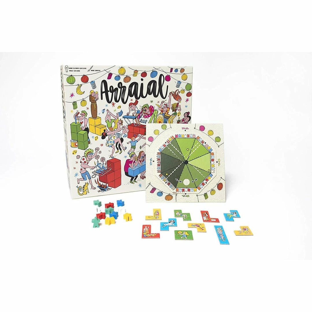 “Arraial” is the name given to traditional Portuguese summer celebrations during which people take to the streets eating, drinking, and having fun in the old neighbourhoods that are bedecked with arches, colourful balloons, popular music, and the aroma of sweet basil. In the game Arraial, players try to make their neighbourhood traditional event the most popular by attracting visitors to their celebration. Grab the most beautiful decorations, hire the most inspired performers, serve the most traditional delicacies, take to the streets, and host the party of the year! Arraial is a fast-paced game in which players take turns spending action points to get the best tiles (decorations, artists…) and place them on their player boards to form the perfect match and attract visitors to their party. In the end, whoever attracts the most visitors in their neighborhood wins.