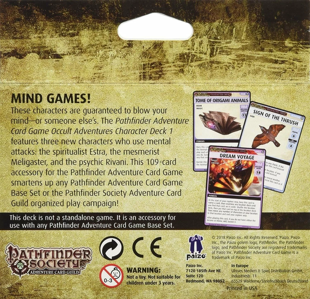 These characters are guaranteed to blow your mind-or, if you prefer, someone else’s. The Pathfinder Adventure Card Game Occult Adventures Character Deck 1 features three new characters who use mental attacks: the spiritualist Estra, the mesmerist Meligaster, and the psychic Rivani. This 109-card accessory for the Pathfinder Adventure Card Game gives you the cards you need to add some brain to your game. Use in any Pathfinder Adventure Card Game Base Set or in the Pathfinder Society Adventure Card Guild organized play campaign!