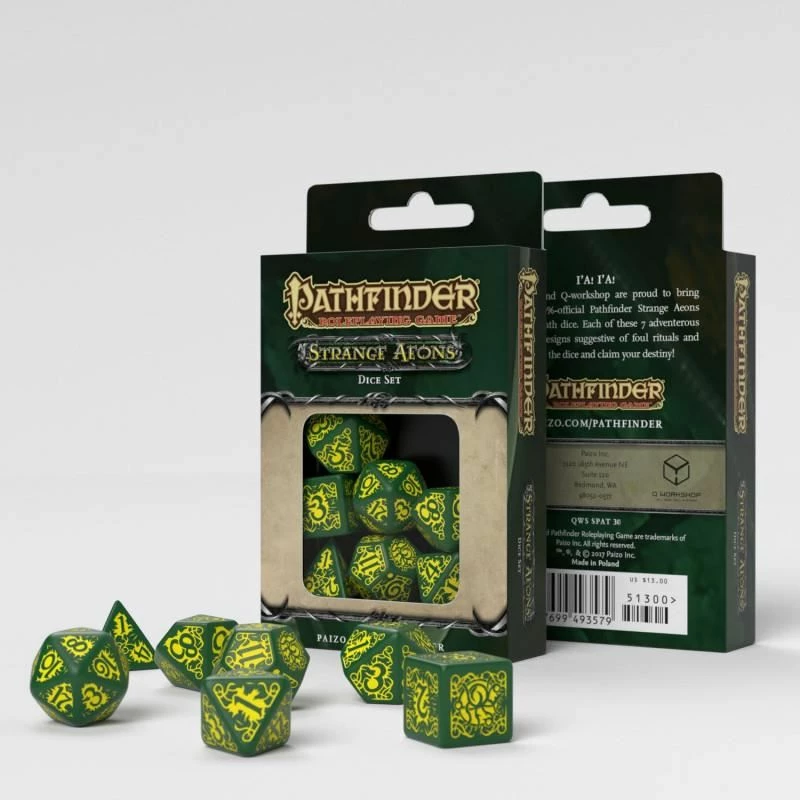 Pathfinder Strange Aeons Dice Set Amulets, from the psychological point of view, help focus on the struggle with stress, madness, and nervous breakdowns. In Pathfinder Strange Aeons Dice Set (7) Q WORKSHOP gives his clients seven amulets in form of dice. This set is dedicated to Pathfinder RPG Adventure Path Strange Aeons. These six chapters long campaign is the tribute to the works of Philip Lovecraft and his universe of Cthulhu Mythos. Dice are made of the high-quality green plastic. In many opinions, the green color calms down and helps to catch breath under stress no matter how big it would be. Sadly, our project was sabotaged by the cultists. They have corrupted the background with sick yellow, very distinctive engravings: ciphers, signs of ave for blasphemous Old Ones and tangled tentacles. All these symbols are so durable that even deep polishing helped nothing. We must admit that this new twisted look has its charms, so we humbly offer them to gamers for evaluation. Maybe the Sign of King in Yellow will help them better immerse in the world of wonderful insanity during successful adventures. Beautiful dice for Strange Aeons Our dice are dedicated to all chapters of breath- and sanity-taking Pathfinder Adventure Path Strange Eons. This set helps you and your characters to defeat madness and find a way out when your heroes without memory will try to solve mysteries of Briarstone Asylum In Search of Sanity (chapter 1) and find an answer to many secrets of small town The Thrushmoore Terror (chapter 2). Then they must be tough and resolved to defeat the nightmares of Dreams of Yellow King (chapter 3). When they recover memory in The Whispers out of Time (chapter 4), they can journey to Neruzavin with many monsters lurking in shadows in What Grows Within (chapter 5). The last chapter Black Stars Beacon will be the final struggle with destiny and chance to save the world in old good Carcossa. So its time to roll our remarkable dice and play. Madness doesnβt wait, like Hastur, Hastur, Hastur…
