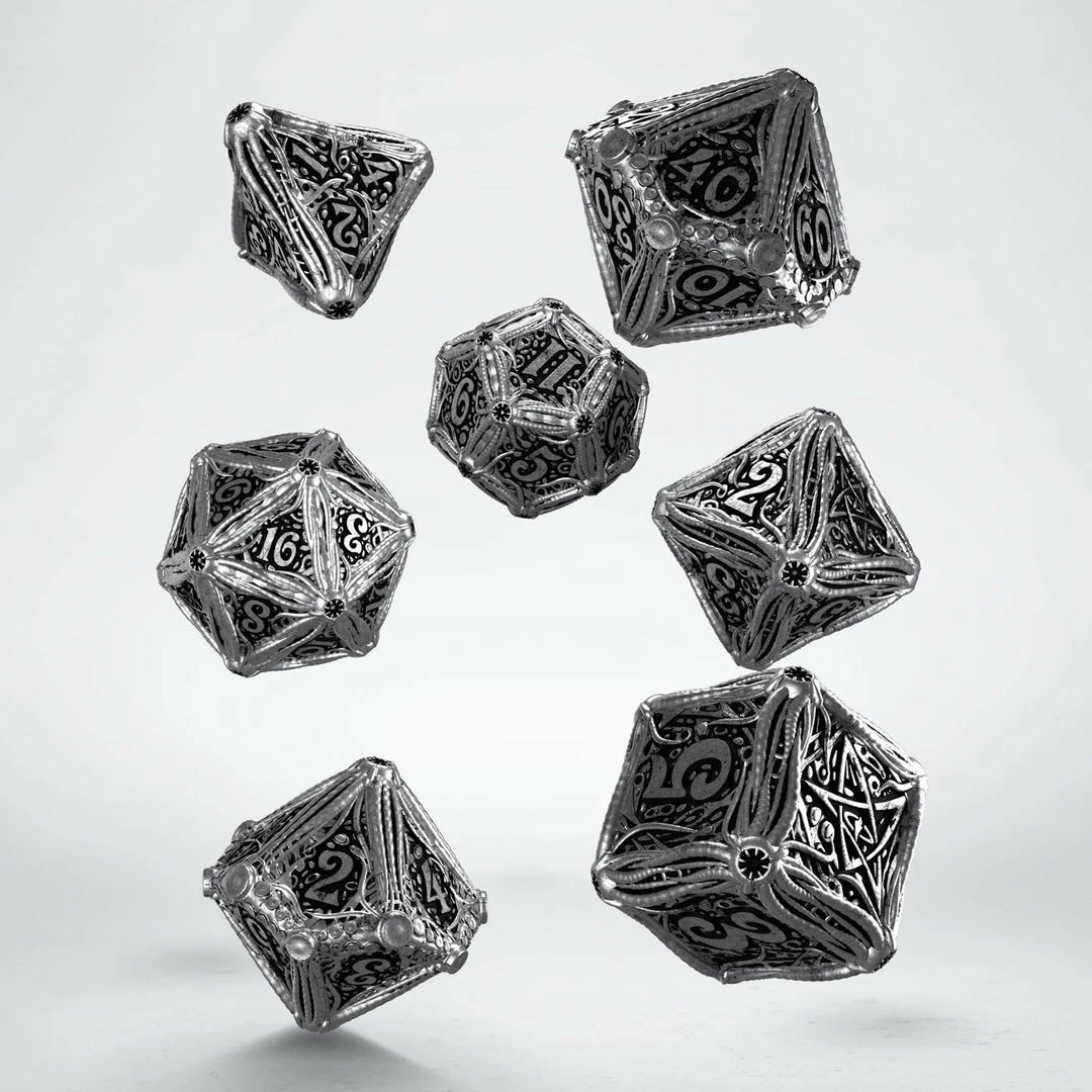 Bring some mythology to the table with these Metal Call of Cthulu Dice! Set includes 7 x 3D dice, each with their own story.