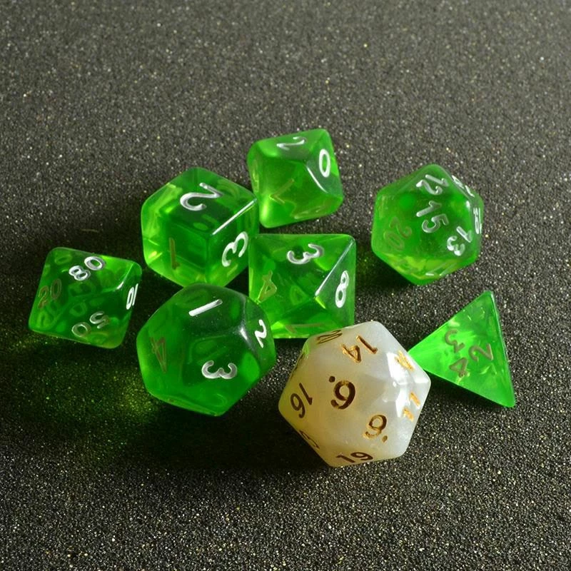 A set of 7 polyhedral Translucent Green dice with white numbers and one white D20 dice with gold numbers. This set is contained in a transparent, durable plastic tube with screw-cap lid.