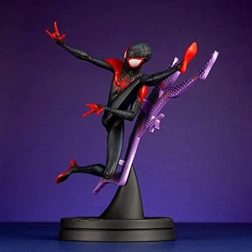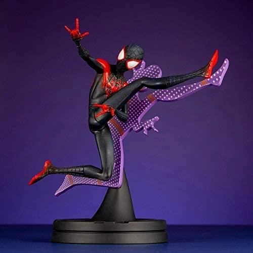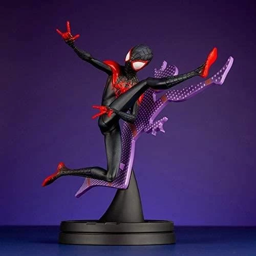 A Kotobukiya Japanese import From the hit animated film Features Miles’ Unique spider-suit Sculpted to showcase Miles in a dynamic pose as he uses his double web shooters His shadow showcases the colorful dotted look of the inside of the particle accelerator as seen in the film