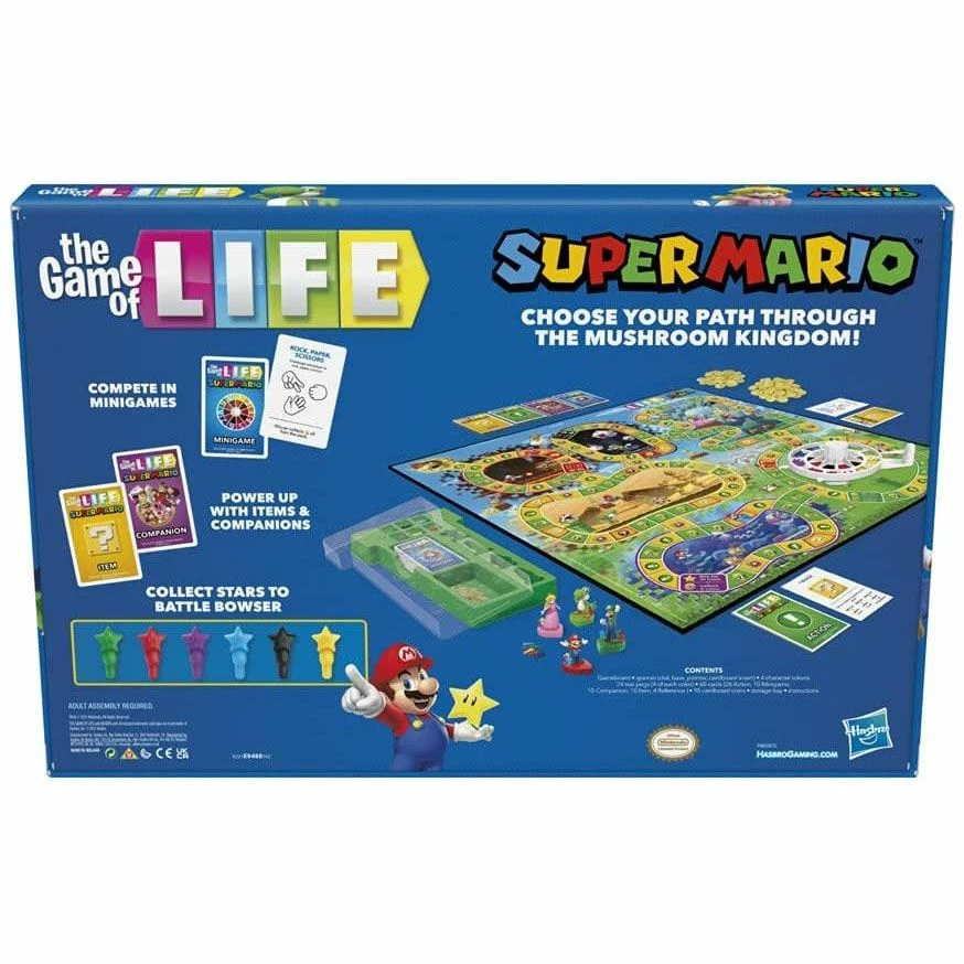 INSPIRED BY SUPER MARIO: it’s The Game of Life board game with an exciting twist featuring Super Mario video game-inspired characters, artwork and gameplay MOVE THROUGH THE MUSHROOM KINGDOM: players move around the gameboard as Mario, Luigi, Peach or Yoshi. They choose their path and which areas to explore as they go through the Mushroom Kingdom BATTLE BOWSER: unlike the classic The Game of Life board game, this edition isn’t about money or retirement. The ultimate goal in this children’s board game is to defeat Bowser MINIGAMES AND STARS: use coins to buy stars for a boost in the battle against Bowser. Compete in fun minigames in a face-off for prizes, and power up with Items and Companions FUN FAMILY GAME: The Game of Life: Super Mario Edition board game is a great choice for game night with the family, and it’s a fun indoor game for children aged 8 and up, for 2-4 players