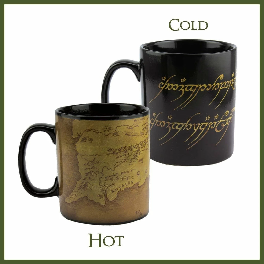 Amaze everyone with this magical mug that features a black exterior decorated with the Elvish ‘One Ring’ text and is transformed to display a map of Middle Earth when the mug is filled with a hot beverage. Officially licensed, this Lord of the Rings mug is a wonderful collectible item and a great piece of memorabilia. Supplied in a full colour branded box, it makes a great gift. 550ml (18.5floz) mug with heat change decal.